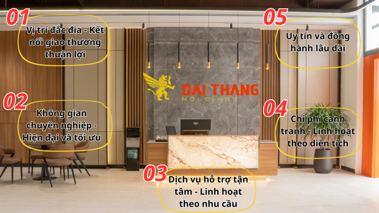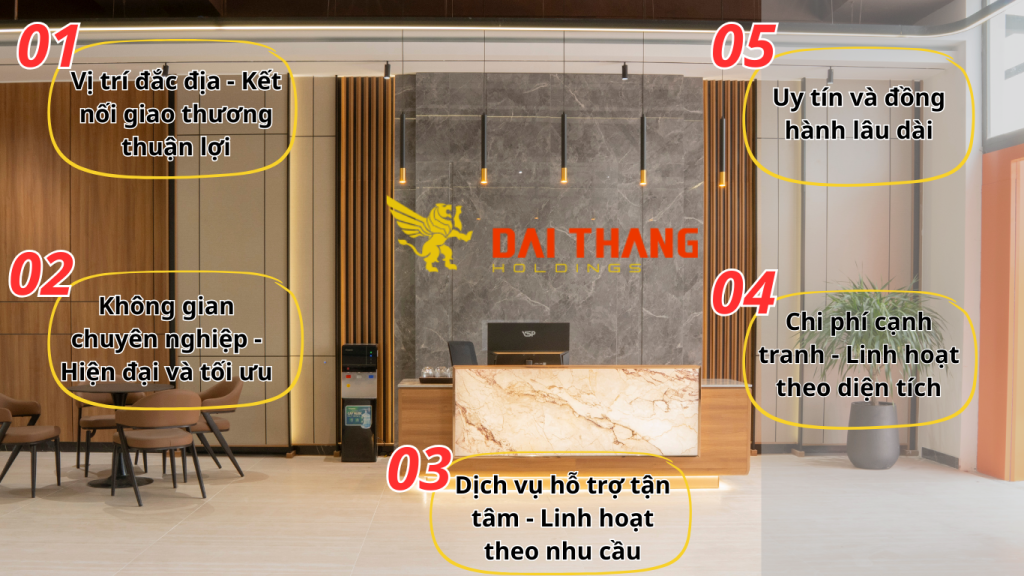 Với mức giá hợp lý, Đại Thắng Offices giúp doanh nghiệp tiết kiệm chi phí vận hành mà vẫn đảm bảo được hình ảnh chuyên nghiệp, đẳng cấp. - 5.Uy tín & đồng hành lâu dài